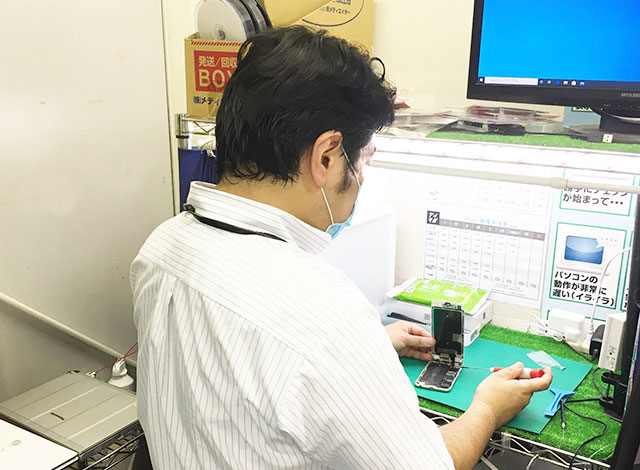 例えば画面のひび割れは主に落下が原因ですが、目に見える画面のひび割れだけではなく、落下により他の箇所に不具合が発生していないか入念にチェックをしております。